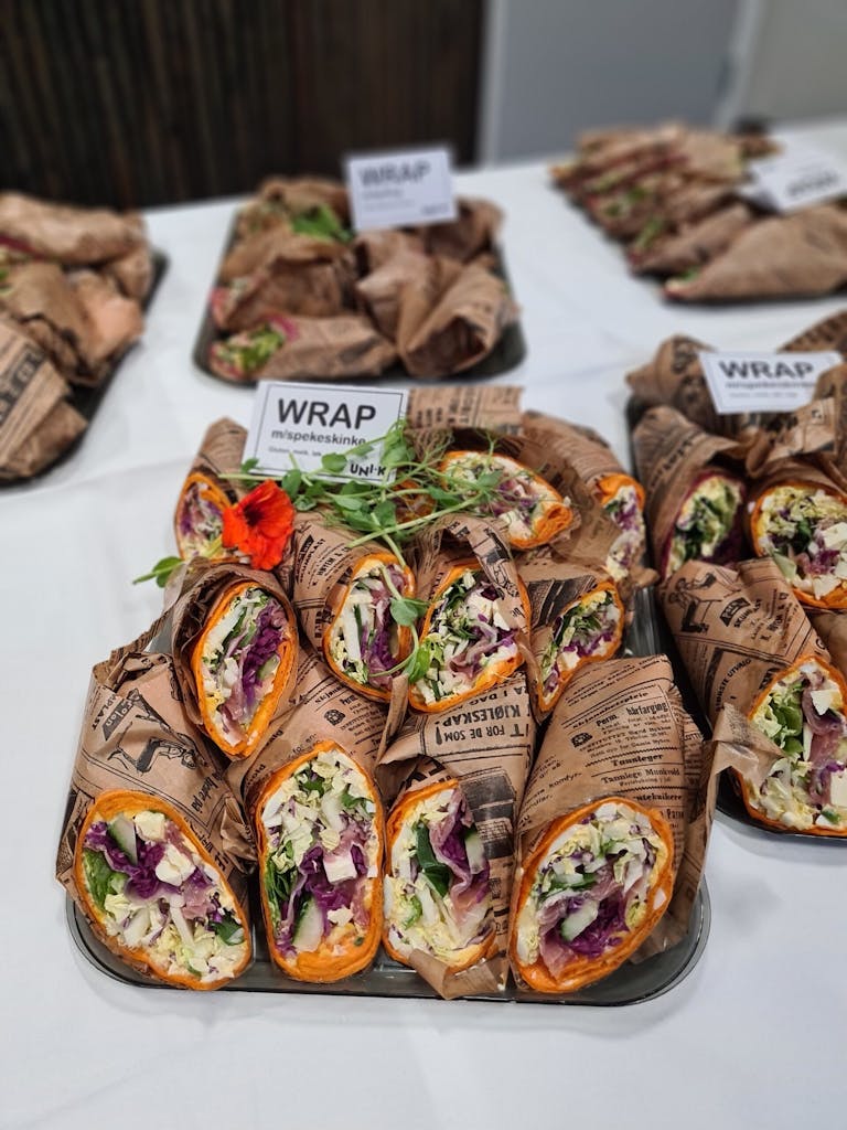 Mat med hjemmelaget tilbehør og selvdyrka pynt. Vi har wraps, sandwicher, salater, rustikke skjever, smørbrød, varm suppe, frukt- og grønnsaksfat og beger, kaker og annet godt – lokalt produsert med mestring og arbeidsglede.